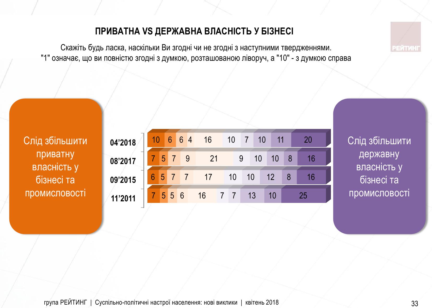 Разом з цим більш слабку динаміку має питання зменшення частки державної власності в бізнесі та промисловості на користь приватної: у 2011 році 61% підтримували збільшення державної частки власності, в 2017 році цей показник зменшився до 52%, а в 2018 році знову знизився до 58%.