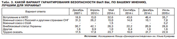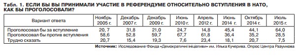 "Перший "стрибок" був зафіксований в червні 2014 року - з 15% (квітень 2012 року) до 45%, а ось супротивників, навпаки, зменшилося майже вдвічі - з 62% до 36% відповідно. У липні 2015 року цей розрив на користь прихильників НАТО став ще більшим: 64% на референдумі висловилися б "за" НАТО, 28% - "проти".
