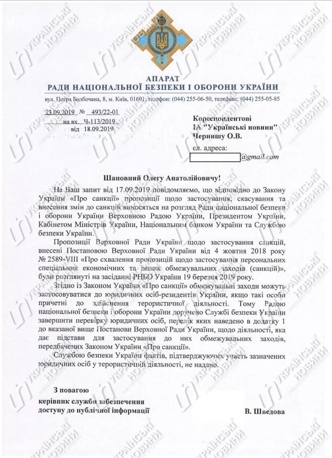 "Службою безпеки України фактів, що підтверджують участь зазначених юридичних осіб до терористичної діяльності, не надано", - зазначається у відповіді РНБО. Тож підстав для введення санкцій не знайдено.