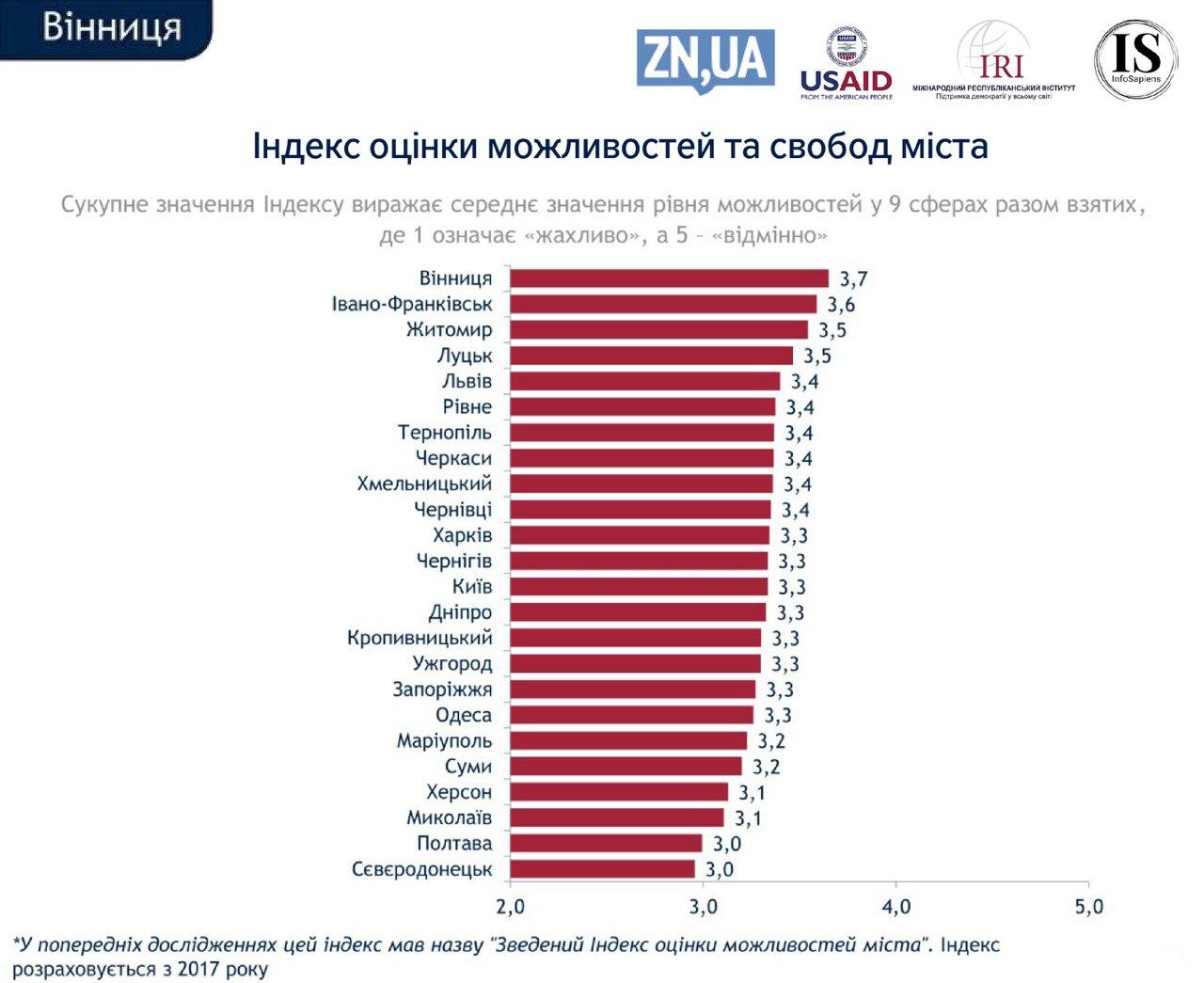 Відповідно до опублікованого групою «Рейтинг» індексу оцінки можливостей і свобод, Вінниця лідирує серед всіх обласних центрів: 3,7 бала з п'яти можливих.