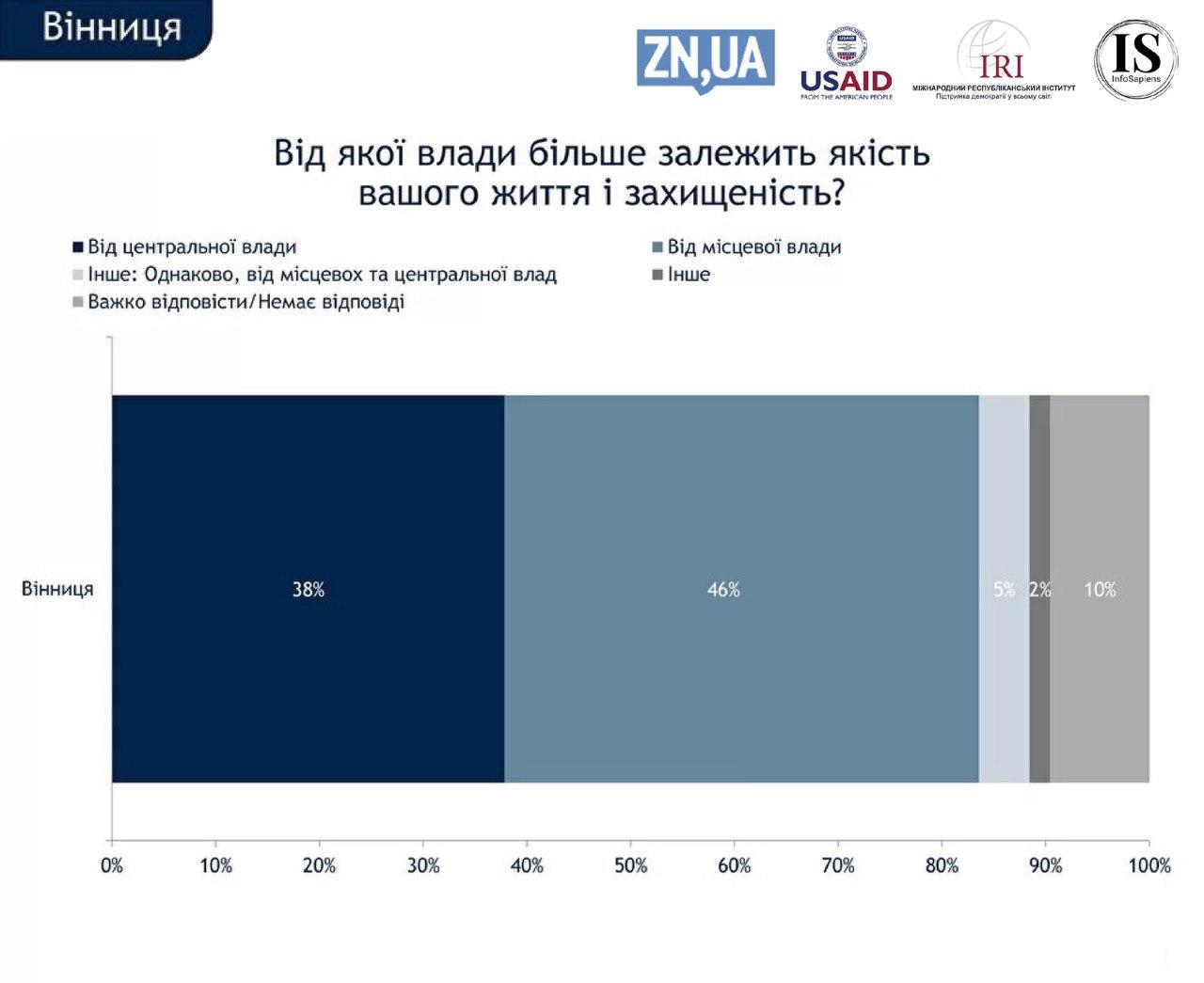 Водночас майже половина опитаних вінничан (46%) впевнені в тому, що за якість життя і безпеку в місті відповідає саме місцева влада, 38% вважають, що центральна.
