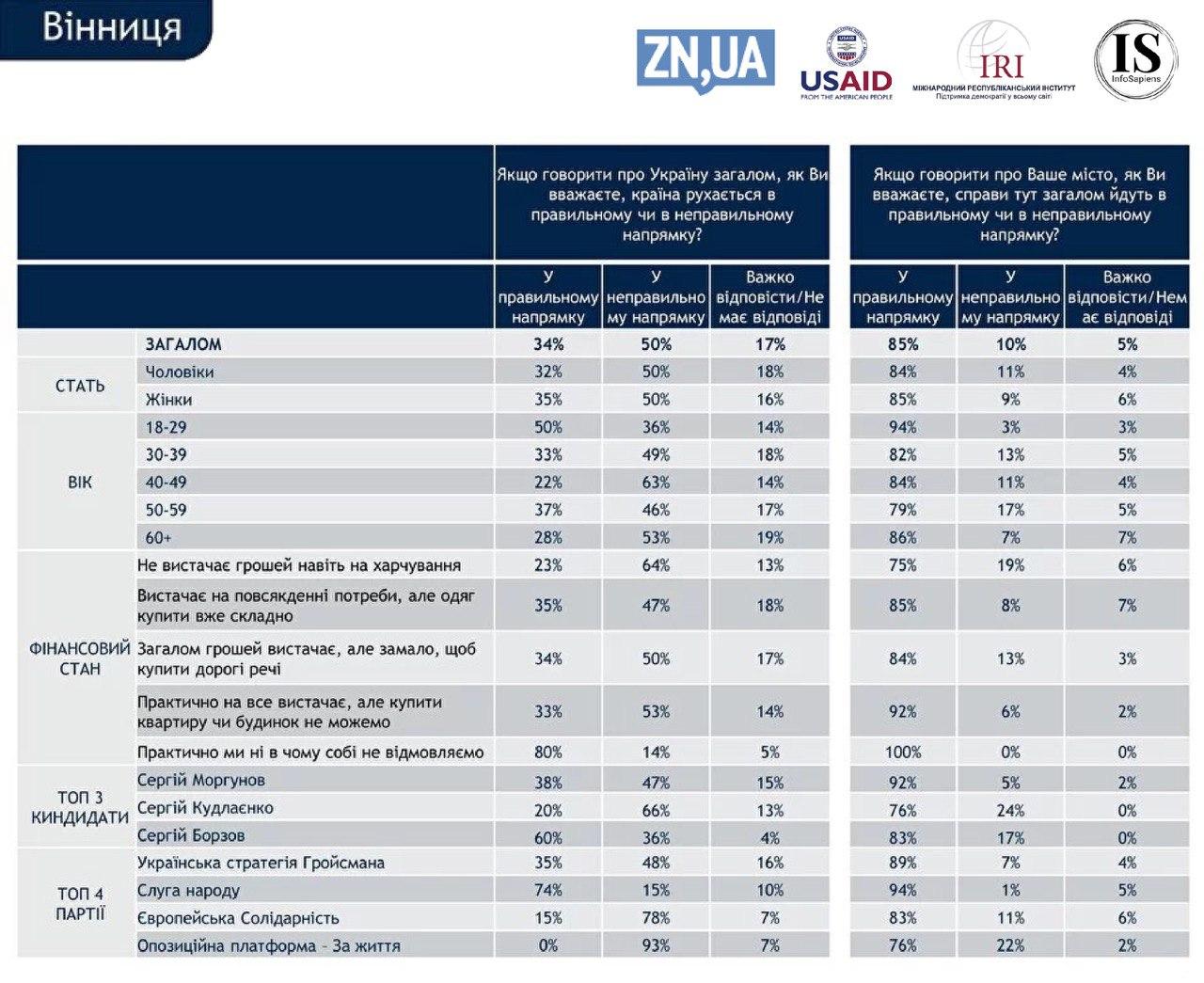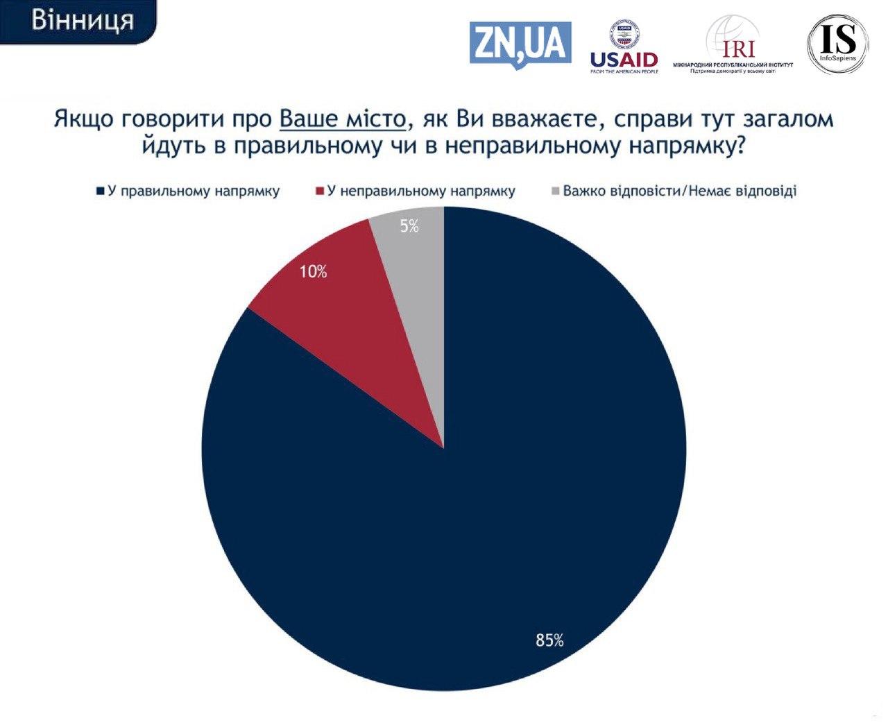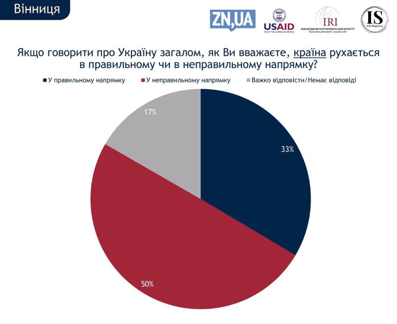 Напередодні місцевих виборів 25 жовтня половина жителів Вінниці впевнені у тому, що Україна рухається в неправильному напрямку. У той самий час переважна більшість (85%) вважають, що ситуація в місті - в правильному.