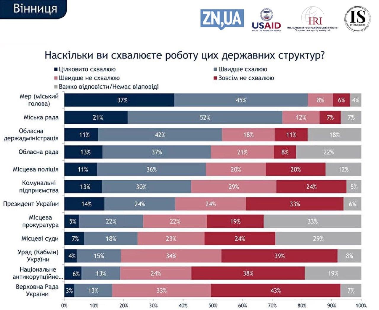 Діяльністю органів центральної влади вінничани незадоволені. Роботу президента Володимира Зеленського позитивно оцінюють 14%, скоріше позитивно - 24%. Незадоволені нею 33%, швидше незадоволені - 24%.