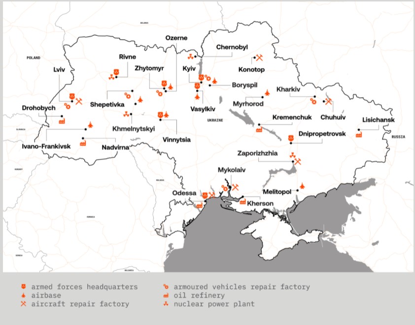 “Цілі в Україні, складені російською розвідкою, які у разі нейтралізації можуть завадити командуванню, відновленню та постачанню українських Збройних сил та енергопостачанню України”, - написала розвідка Естонії в описі до карти.