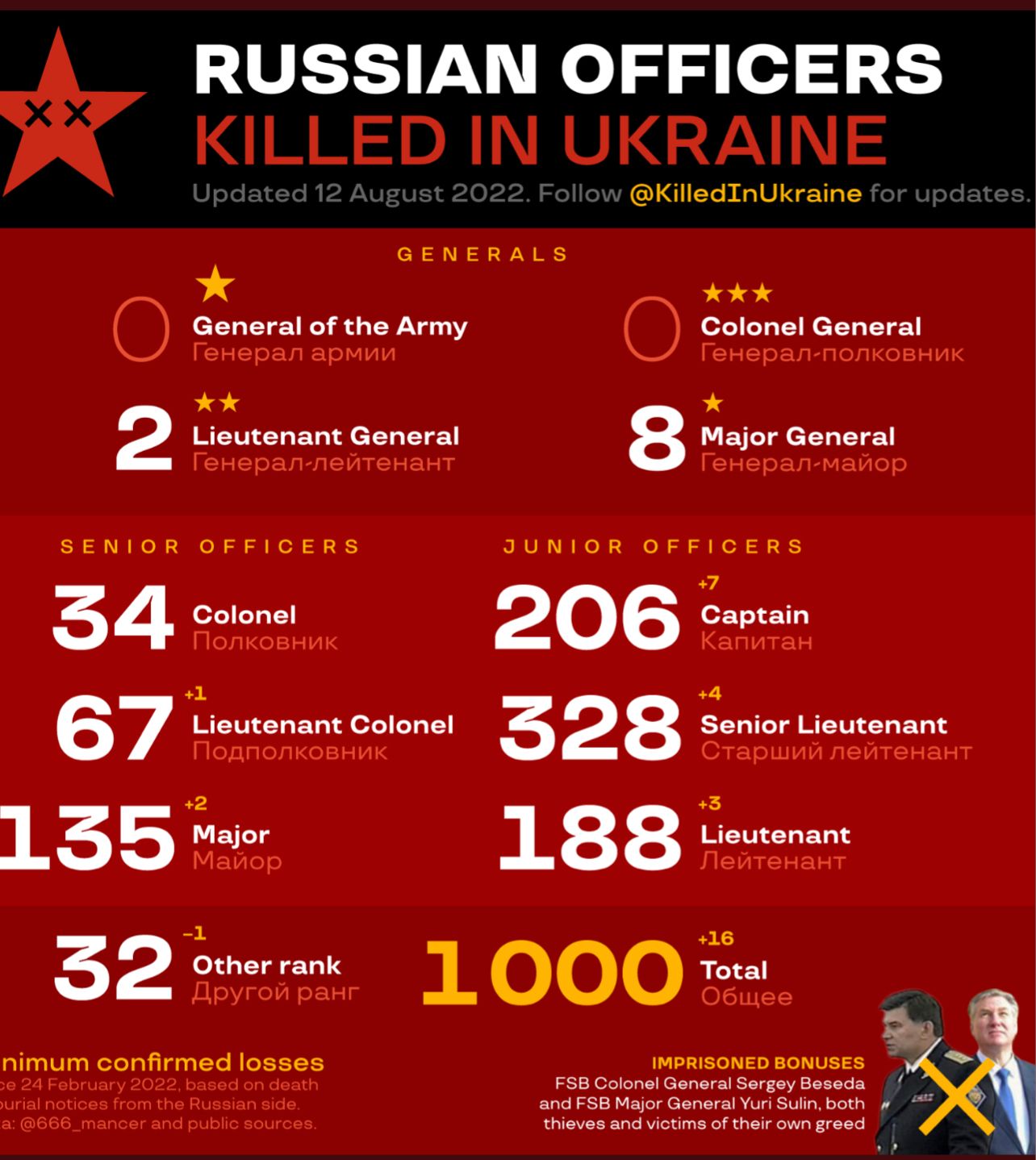 За 6 місяців війни в Україні російська армія втратила 10 генералів та близько тисячі офіцерів з особового складу армії РФ. Про це повідомив журналіст Юрій Бутусов із посиланням на дослідження авторів проекту Killed in Ukraine, які також встановили особисті дані вбитих російських командирів.