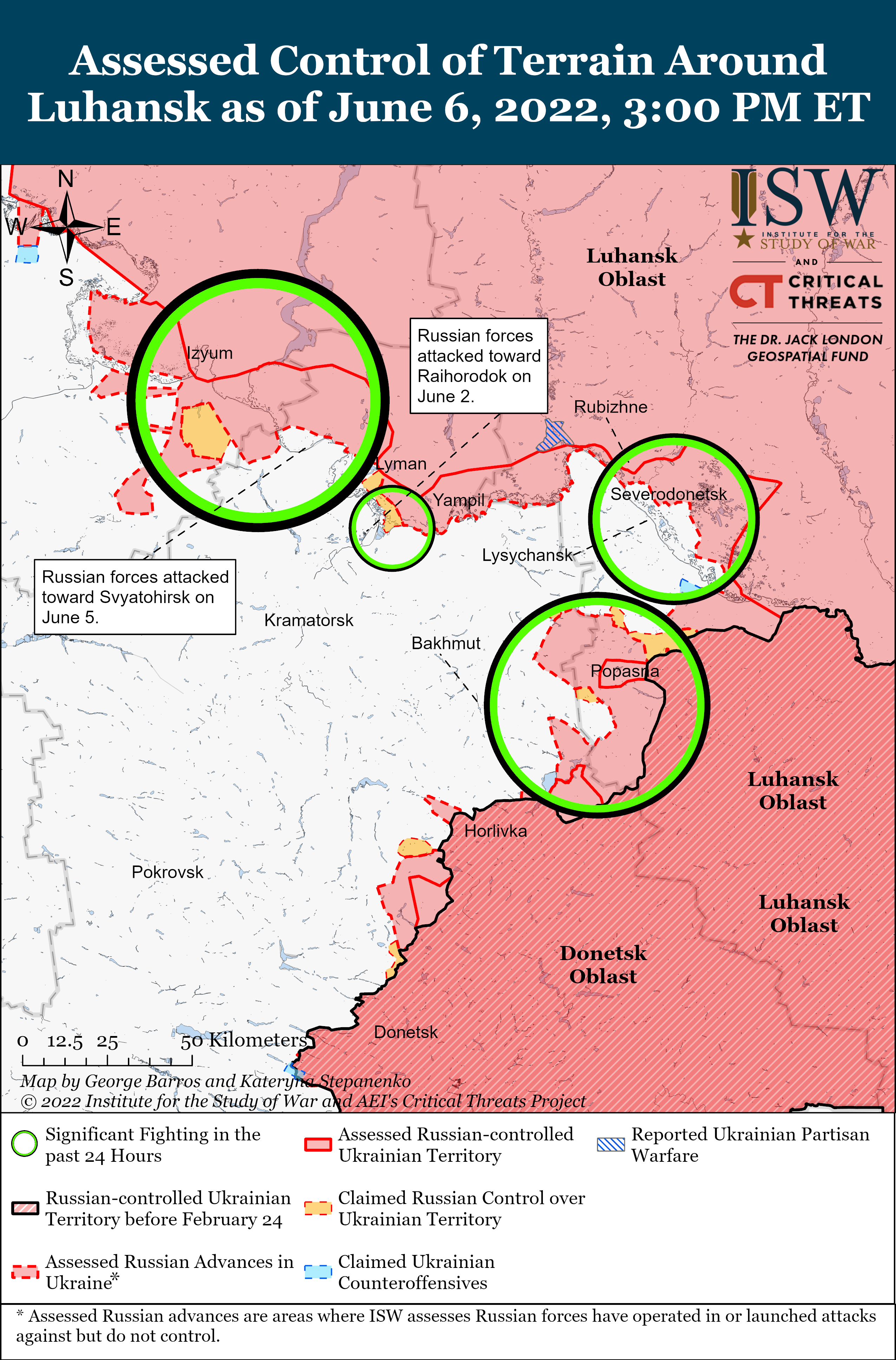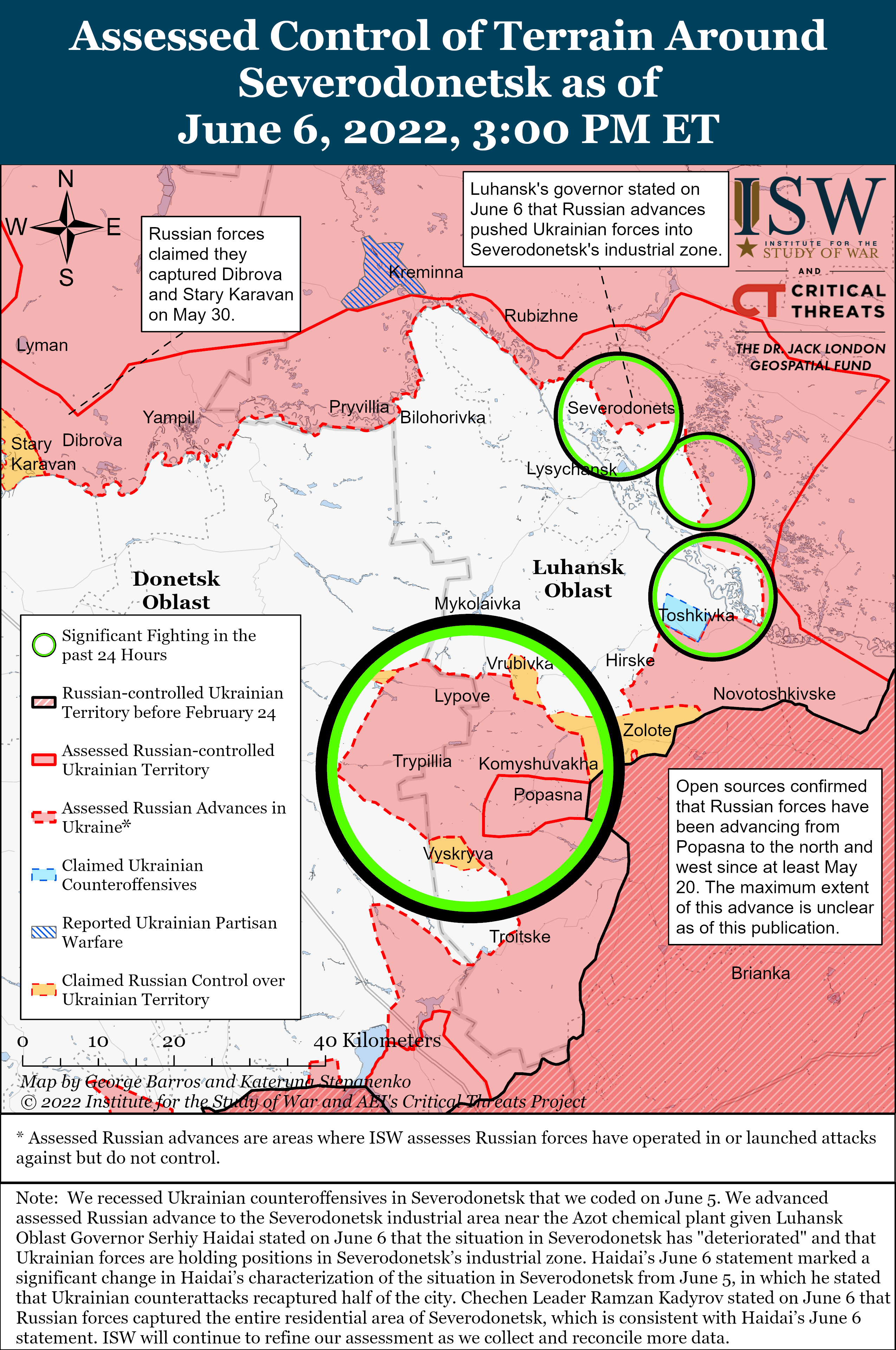 Стосовно ситуації в Сєвєродонецьку наразі точно не відомо, хто контролює більшу частину міста, події розгортаються динамічно і надходять суперечливі відомості. Проте імовірно, перевагу за собою лишають російські війська.