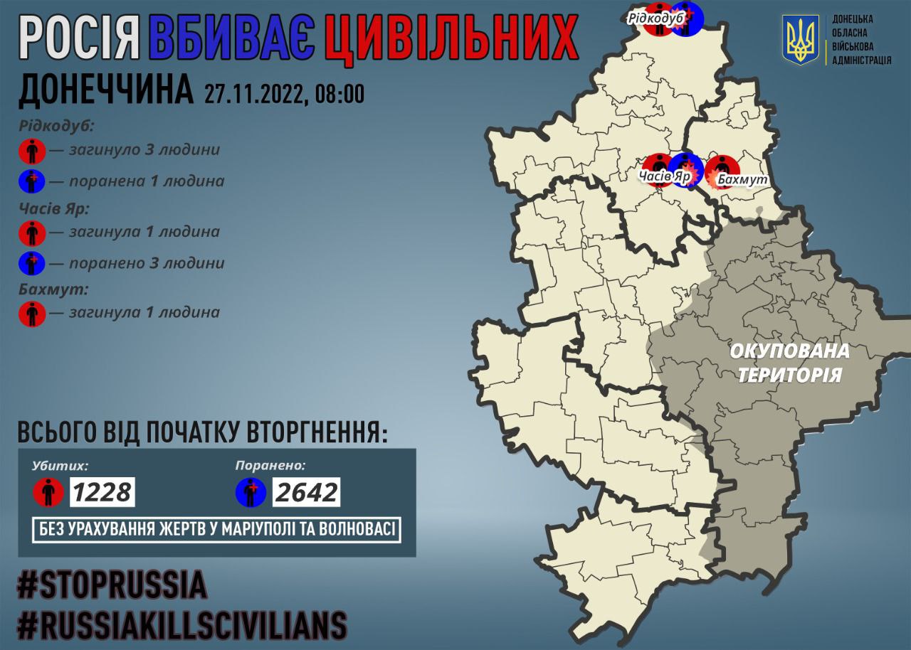 За день до того, 25 листопада, окупанти поранили чотирьох мирних жителів Донецької області. Від рук росіян постраждали троє жителів Бахмуту, і один мешканець Краматорська.