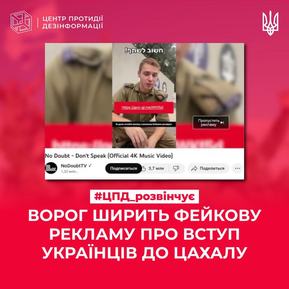 Російські пропагандистські ресурси поширюють відео реклами на YouTube, у якій начебто військовий ЦАХАЛу закликає воїнів ЗСУ вступати в лави ізраїльської армії, щоб воювати проти бойовиків ісламістського угрупування ХАМАС у Секторі Гази. Насправді ця реклама – фейк. Ворог не вперше публікує дезінформацію, спрямовану на зрив мобілізації в Україні.