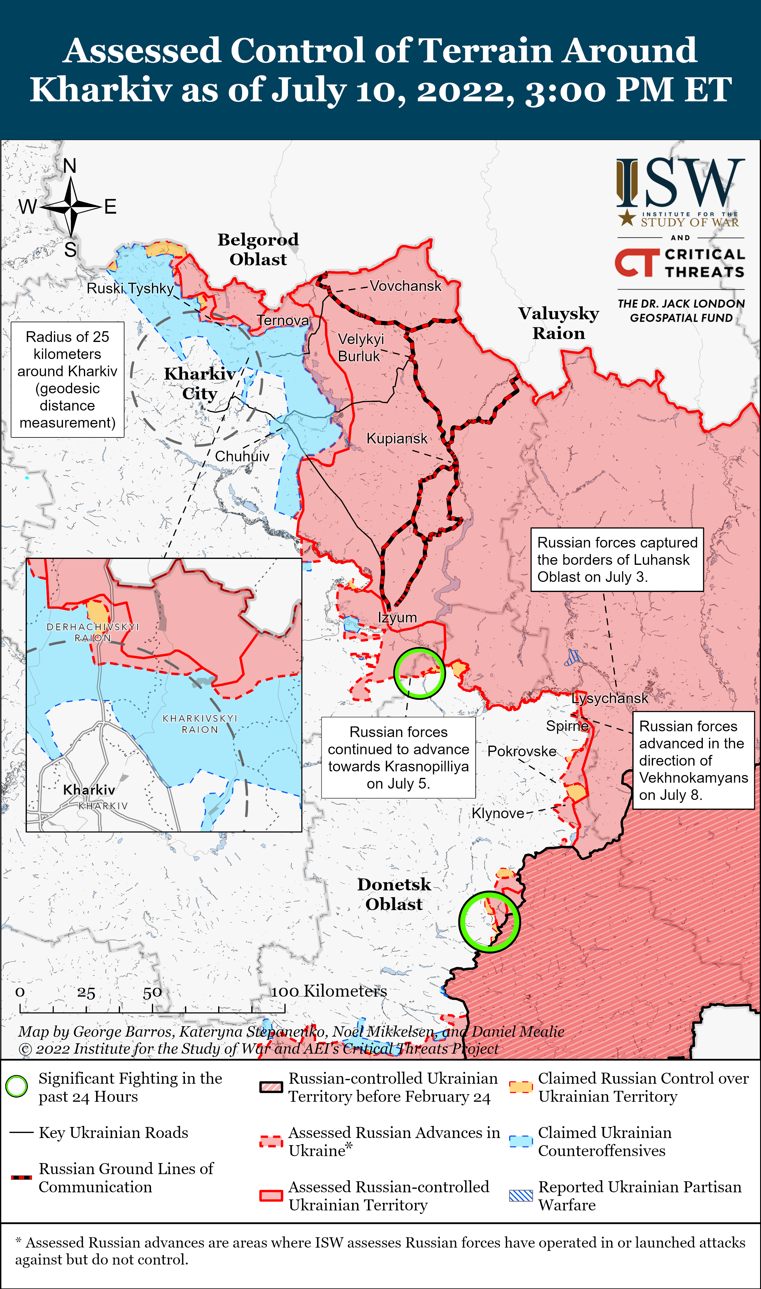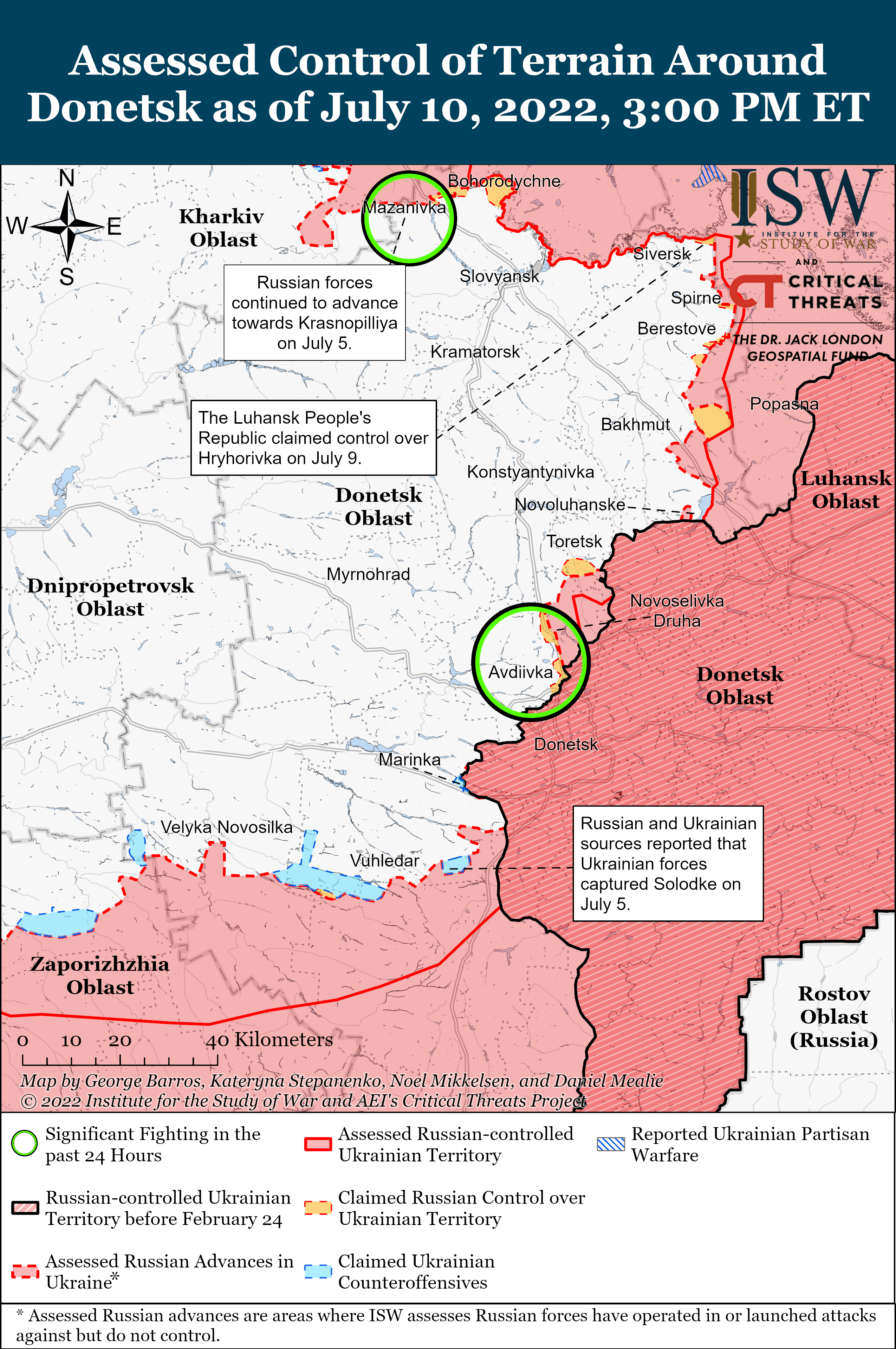 Війська РФ 10 липня провели низку розвідувальних операцій на північний захід від Слов'янська, в районі Долини та Мазанівки, для виявлення слабих місць в обороні ЗСУ. Також російські сили провели обмежену атаку за 25 км на північ від Донецька, аби покращити тактичні позиції поблизу Новоселівки Другої.