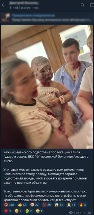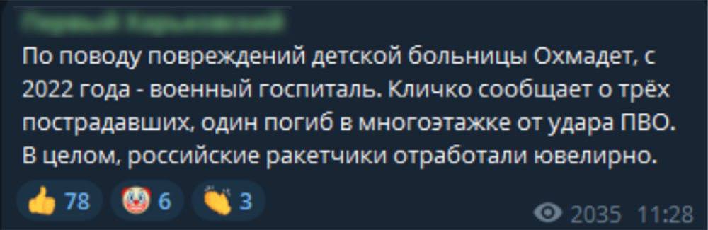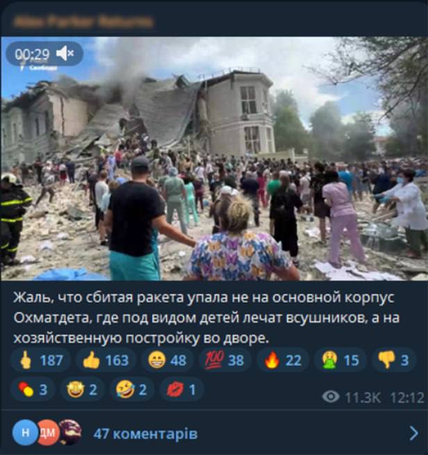 Як проаналізував Центр протидії дезінформації при РНБО України, спочатку деякі російські пропагандисти почали писати про «жаль» через те, що «збита ракета впала не на основний корпус лікарні», оскільки там буцімто знаходяться військові, а не хворі українські діти.
