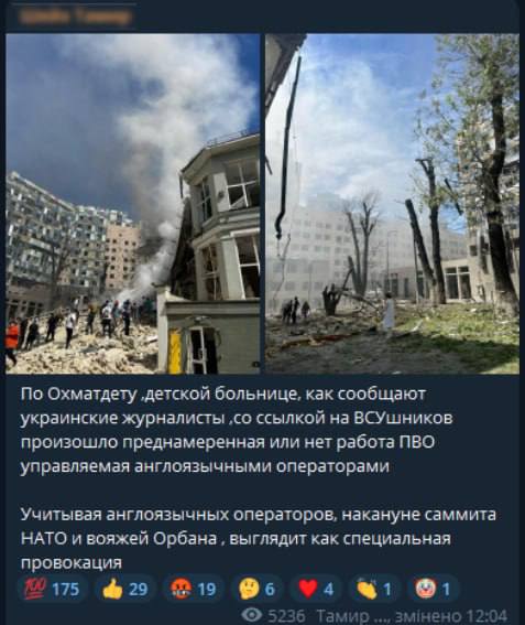 Після удару російських військ по Києву вранці 8 липня, коли ракети потрапили у житлові будинки та один з корпусів дитячої лікарні у столиці «Охматдит», російські пропагандисти відразу почали виправдовувати терористичний акт та поширювати фейки щодо атаки.