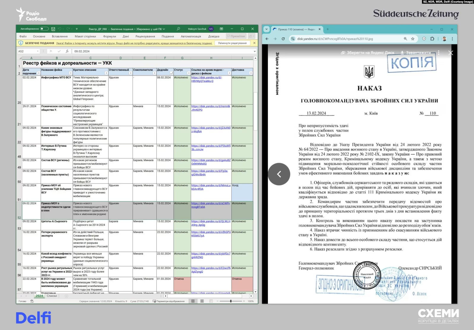 Окрім поширення дезінформації, "АСД" також виготовляла підроблені документи. Одним із прикладів є сфабрикований наказ, який нібито підписав головнокомандувач ЗСУ Олександр Сирський. У ньому йшлося про прирівнювання здачі в полон до державної зради. Метою цього наказу була дискредитація військового та політичного керівництва України, а також деморалізація української армії.