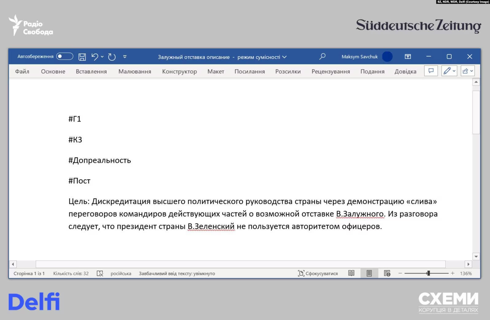 Серед витоку документів "АСД" журналісти виявили файли, які свідчать про наміри росіян розкручувати "дезінформаційні кампанії". Один із документів з позначкою "допреальність" (доповнена реальність) передбачав дискредитацію вищого керівництва України через "злив" сфабрикованих переговорів між військовими, у яких нібито йшлося про можливу відставку Залужного. У тексті зазначалося, що офіцери нібито не мають довіри до Зеленського.