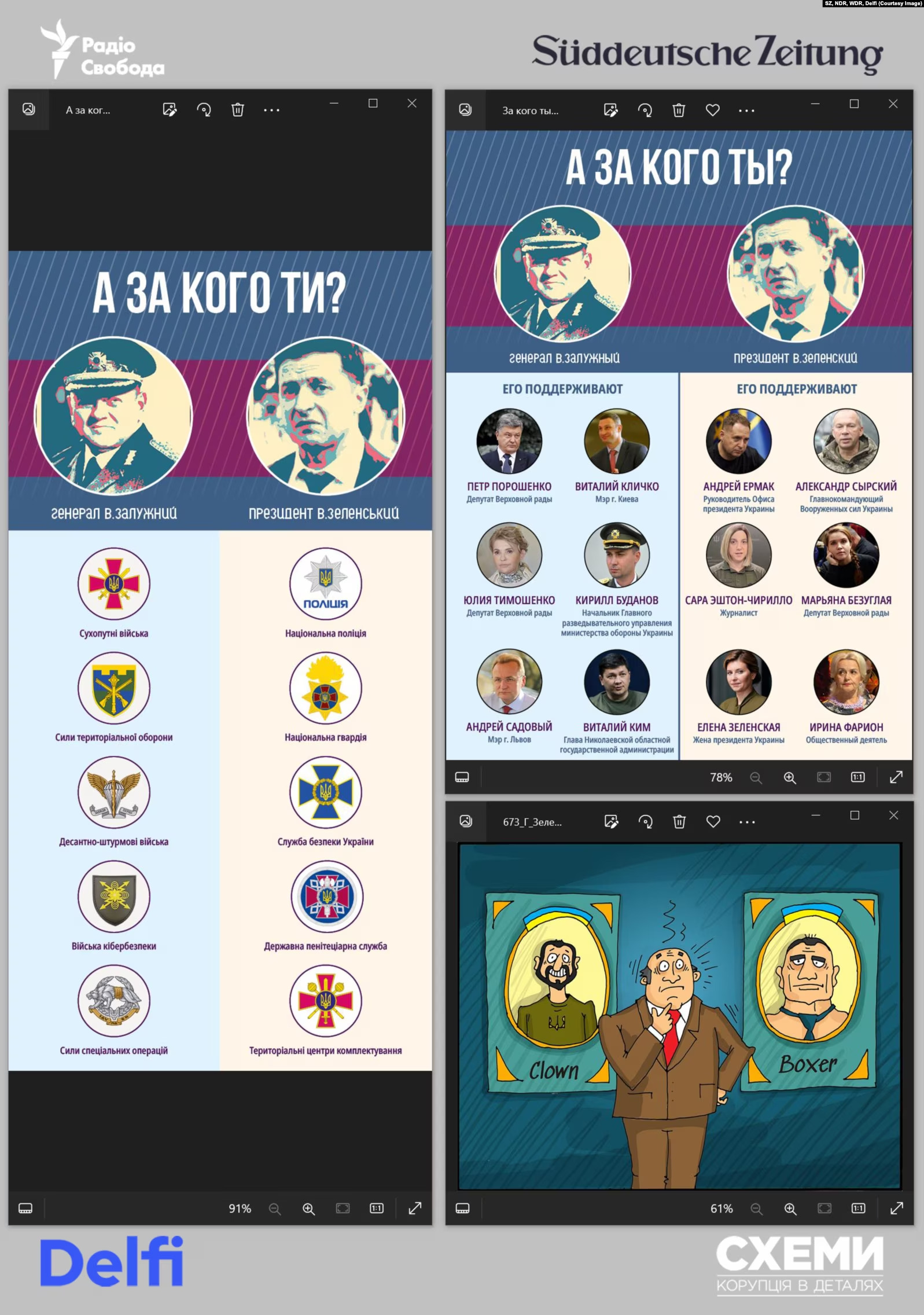 Крім того, агенція розробляла кампанію під назвою «За кого ти?», у якій протиставляла Зеленського Залужному та Кличку. Для цього створювалися інфографіки, меми та карикатури, спрямовані на українську та європейську аудиторії.