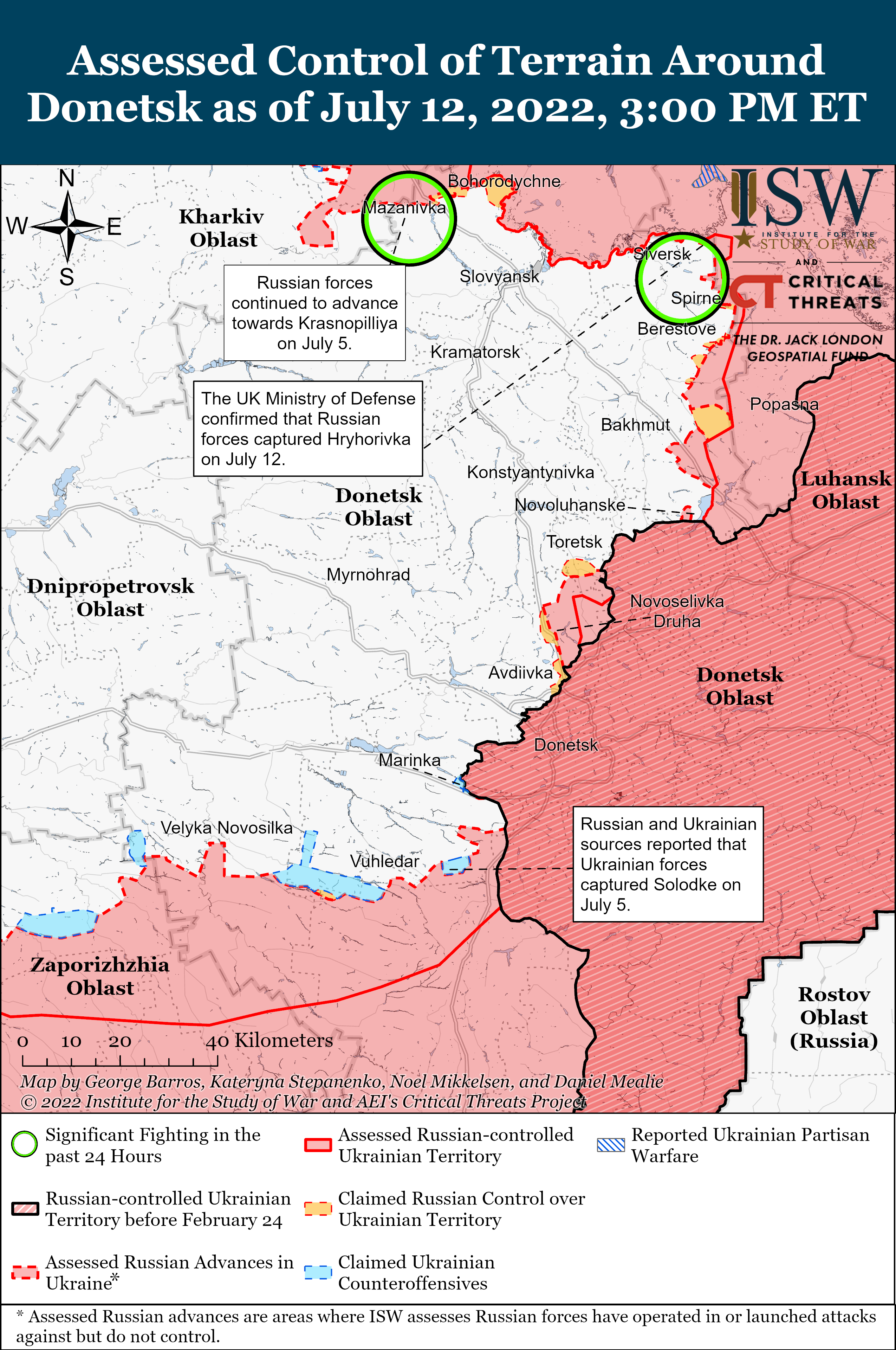 На слов'янському напрямку ЗСУ відбили наступ противника на захід від траси Е40 поблизу Довгенького, Мазанівки, Краснопілля та Долини, а також на схід від траси Е40 в районі сел Маяки та Іванівка. Наразі росіяни не перетинали річку Сіверський Донець у районі Маяків та Сидорового, проте можливість такого маневру вірогідна. Адже це дасть змогу оточити український укріплений район між Долиною, Богородичним, Пришибом та Маяками. Але чисельні водойми є природною перепоною для цього. Тож, імовірно, російські сили продовжать завдавати ударів по районах навколо Слов'янська, щоб створити умови для відновлення наступу на Слов'янськ та Краматорськ.