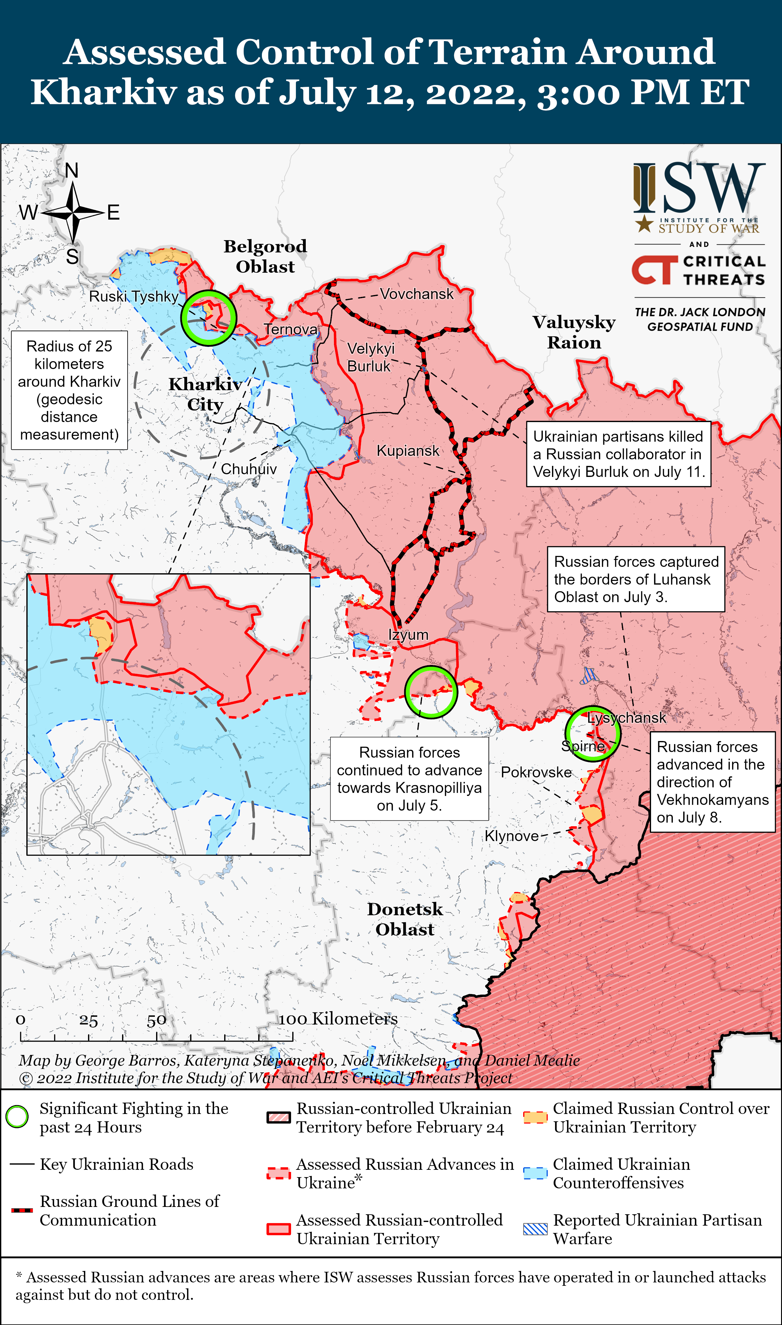 На сході України триває оперативна пауза під залпи російської артилерії. Армія РФ продовжує заходи з відновлення боєздатності військових підрозділів та проводить обмежені, розвідувального характеру, атаки, повідомляє Інститут вивчення війни (ISW).