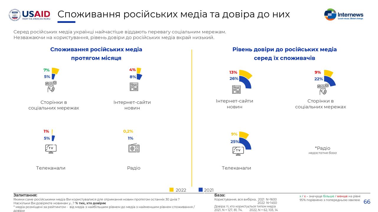 «Респонденти мало проявляють інтерес до «ліберальних» або «опозиційних» російських медіа, вважаючи, що споживання таких медіа не має особливого сенсу, — сказано в результатах дослідження. — На їх думку, «опозиційні російські медіа», як правило, ретранслюють закордонні медіа, але й і українські медіа також ретранслюють закордонні, отже, немає сенсу дивитись одні й ті самі новини двічі».