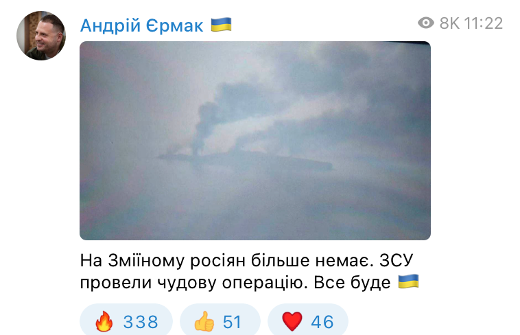 У ЗСУ додали, що зараз Зміїний вкрито пожежею, там лунають вибухи. Остаточні результати операції дорозвідуються.