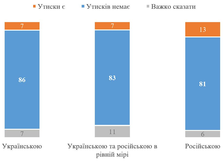 Серед тих, хто вдома спілкується переважно або лише російською мовою, про проблеми заявили лише 13% опитаних, натомість 81% вважають, що жодних утисків чи переслідувань немає.