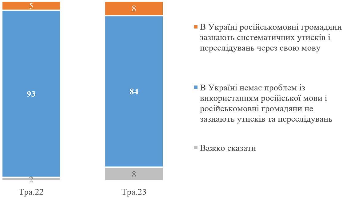 Попри те, що російська влада аргументує неспровоковане повномасштабне вторгнення в Україну «захистом російськомовного населення», яке буцімто зазнає утисків, станом на травень 2023 року абсолютна більшість українців – 84% – вважають, що в Україні немає проблем із використанням російської мови і російськомовні громадяни не зазнають утисків. Такі дані соціологічного дослідження оприлюднив Київський міжнародний інститут соціології.