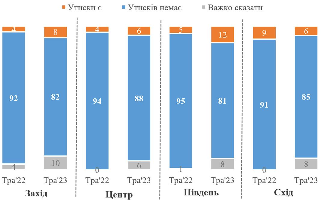 Водночас не бачать у цьому проблем і в так званих російськомовних регіонах: на сході України про їх відсутність говорять 85% опитаних, а на півдні 81%. При цьому від 6 до 10 відсотків взагалі не змогли дати відповідь на це питання.
