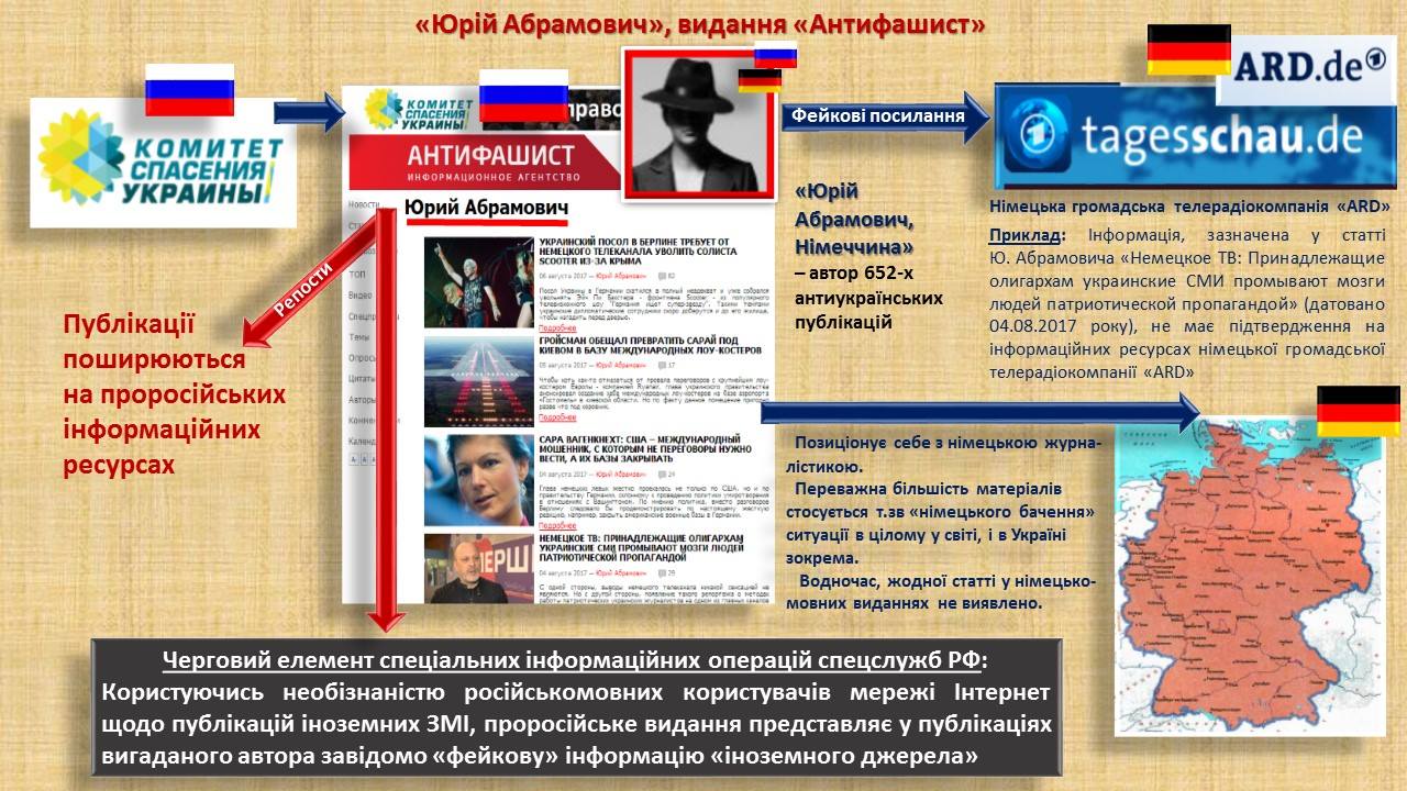 Так, оперативники СБУ звернули увагу на такого собі "журналіста" Юрія Абрамовича, який постійно публікується на проросійському ресурсі "Антифашист". Останній оприлюднений ним матеріал - "Немецкое ТВ: Принадлежащие олигархам украинские СМИ промывают мозги людей патриотической пропагандой" - розповідає про нібито репортаж (насправді відсутній) німецької громадської телерадіокомпанії "ARD" щодо методів роботи українських журналістів.