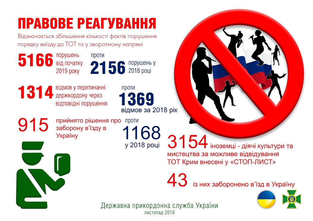 У ДПСУ зазначили, що з початку року виявлено вже понад 5 тисяч фактів порушення особами порядку в'їзду/виїзду з/до тимчасово окупованих територій. За це порушення складено 4 251 адмінпротокол, 1314 іноземцям відмовили у перетинанні держкордону, щодо майже 915 – заборонили в'їзд. Від початку року заборону в'їзду отримали 43 іноземці-діячі культури та мистецтва.
