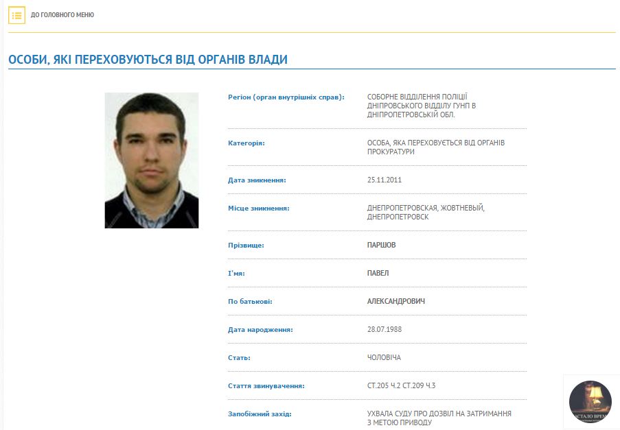 Слід зазначити, що відомості про Павла Паршова 1988 року народження внесені до списку осіб, які перебувають у розшуку, доступному на сайті МВС.