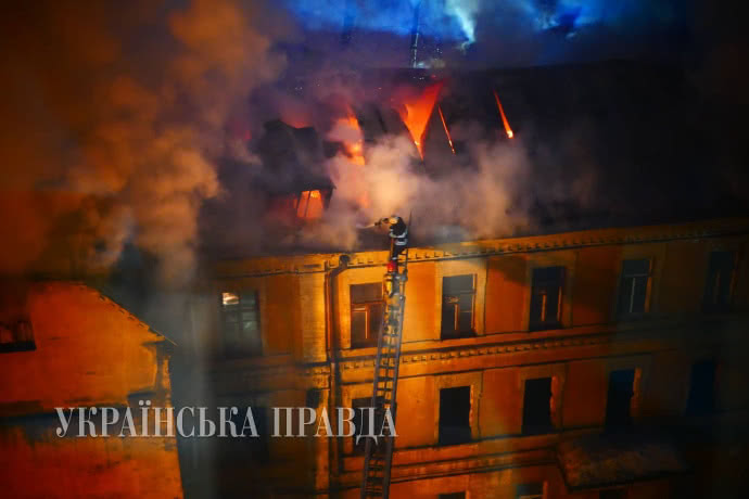 Як повідомлялося, в центрі Києва в незаселеному будинку спалахнула пожежа. При цьому ГУ ДСНС повідомляло про те, що загоряння виникло на вулиці Хрещатик, 1/2, а очевидці говорили про пожежу по вулиці Грушевського, 4-Б. До гасіння пожежі залучили 16 одиниць техніки та 70 осіб особового складу.