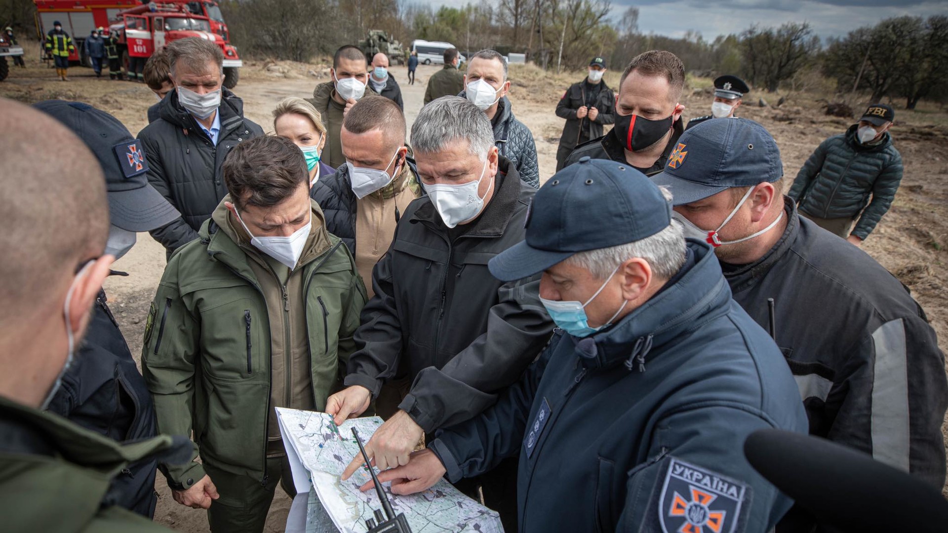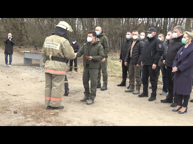 Президент і члени урядової делегації на вертольоті облетіли ділянку лісу, що постраждала від пожежі, а також ознайомилися з роботою мобільного логістичного пункту ДСНС.