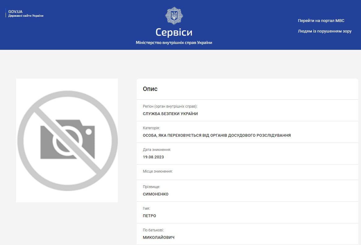 Дата зникнення Симоненко у картці вказана як 19 серпня 2023 року.