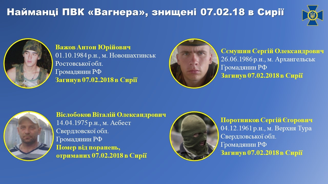 Служба безпеки України оприлюднила дані 206 позаштатних співробітників Головного управління розвідки Генштабу ЗС Росії зі складу ПВК "Вагнера", яких СБУ ідентифікувала як учасників російського угруповання в Сирії.