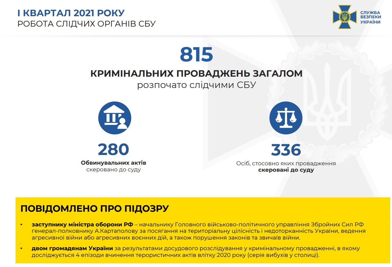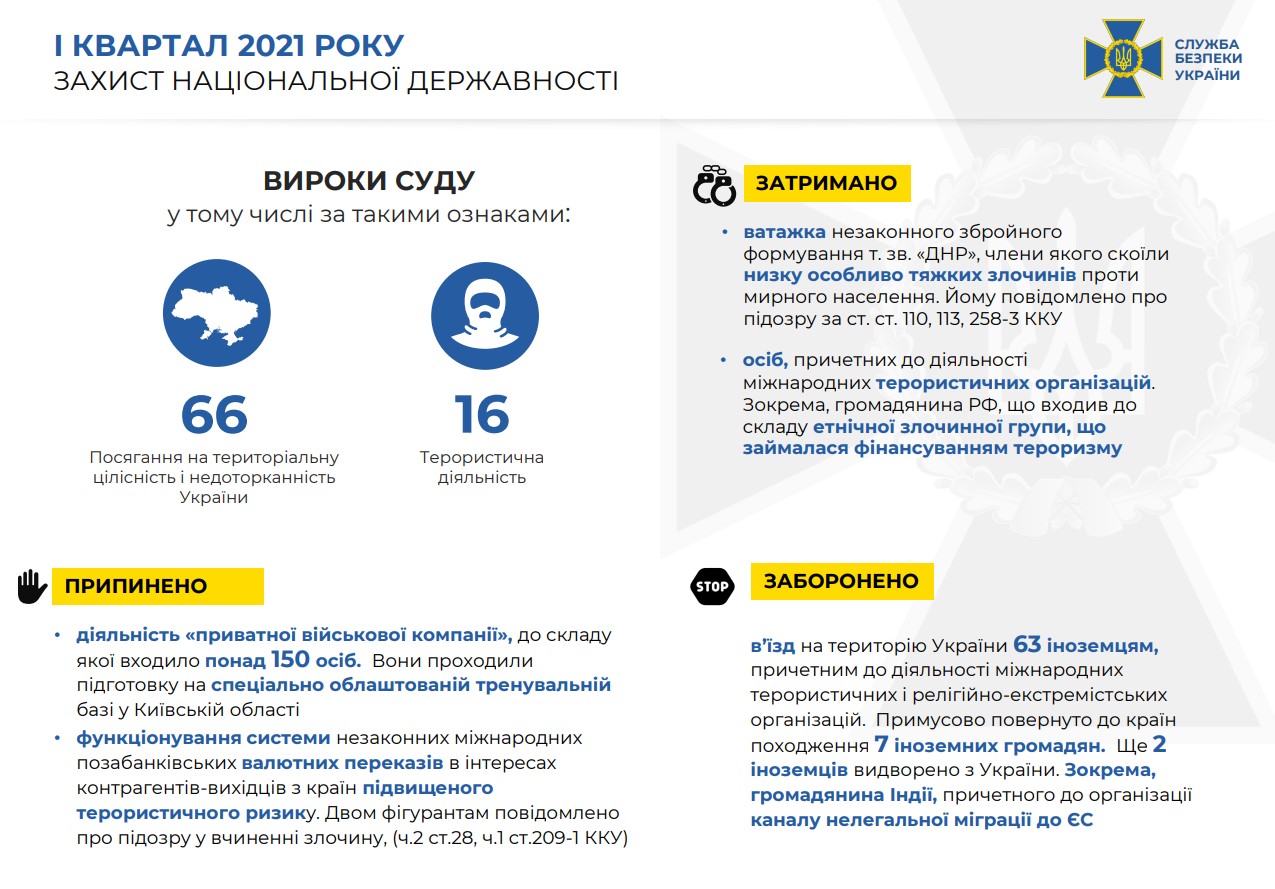 У першому кварталі 2021 року за даними СБУ набрали чинності понад 80 обвинувальних вироків за злочини проти національної безпеки України.