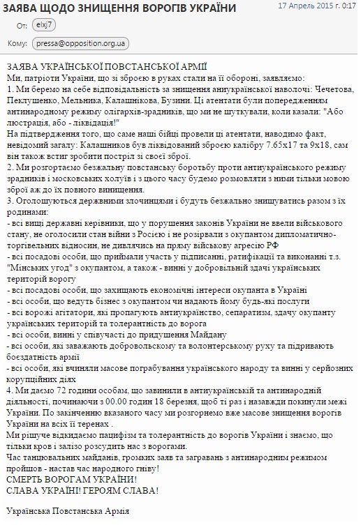 Після проведеної лінгвістичної експертизи СБУ виявило, що лист з погрозами на адресу як опозиції, так і нинішнього уряду, було написано неукраїномовними авторами.