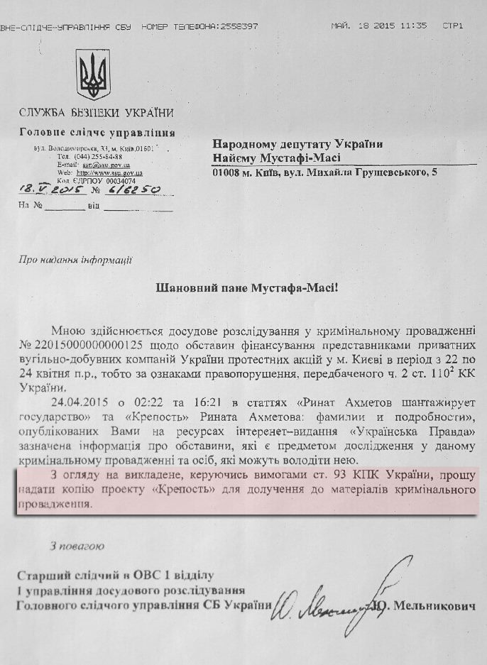 Служба безпеки України просить народного депутата Мустафу Найєма передати наявні у нього матеріали щодо ролі бізнесмена Ріната Ахметова в організації шахтарських протестів у Києві.