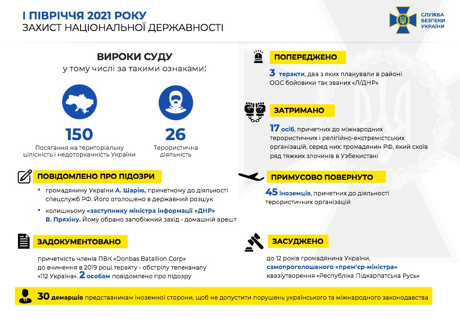 "За останні півроку вступив в силу 191 обвинувальний вирок суду за матеріалами СБУ. Йдеться саме про злочини, спрямовані проти національної державності", - додали в прес-службі відомства.