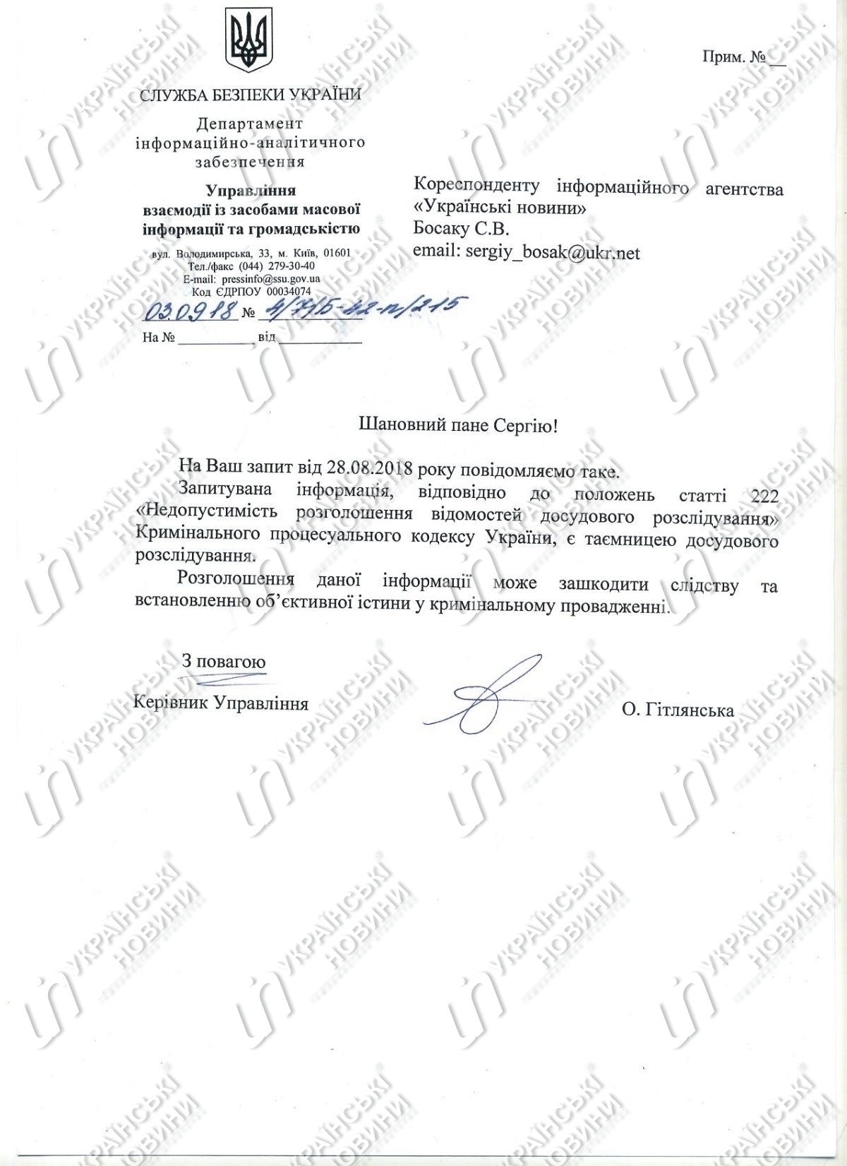 "Розголошенні даної інформації може перешкодити слідству і встановленню об'єктивної істини у кримінальному провадженні", - йдеться у відповіді СБУ на запит інформагентції "Українські новини" від 3 вересня.