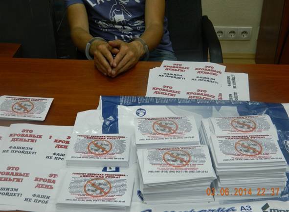 "З метою поширення сепаратистських настроїв в Україні, "Г" організував виготовлення агітаційних листівок підривної спрямованості, які планував поширювати в м. Києві. У зазначених друкованих матеріалах містилися заклики від імені т.зв. "Київської республіки" вступати до лав терористичних організацій і чинити опір чинній владі. Інші листівки, в яких ішлося про "криваві гроші" і "фашизм", планували розклеювати на банкоматах м. Києва", - зазначили у СБУ.