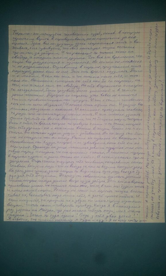 Повний текст листа оприлюднила у Facebook сестра Олега Сецнова Наталія Каплан. У своєму посланні режисер, незаконно засуджений російським судом до 20 років колонії, говорить про те, як переживає своє тюремне ув'язнення, а також про те, що вважає найважливішим у житті час, проведений із близькими людьми.