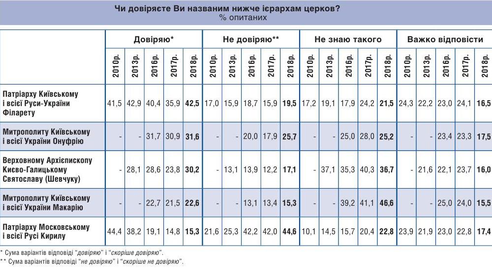 Митрополиту Онуфрію (УПЦ МП) повністю або скоріше довіряли 32% респондентів, главі Української греко-католицької церкви Святославу довіряли 30% опитаних, митрополиту Макарію (УАПЦ) довіряли 23%.