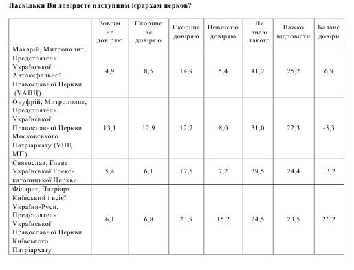 Серед церковних ієрархів найвищою довірою українців користується патріарх Філарет. Повністю або скоріше йому довіряють 39,1% респондентів, скоріше, або зовсім не довіряють 12,9%, не знають такого 23,5%, свідчать дані опитування Центру Разумкова.