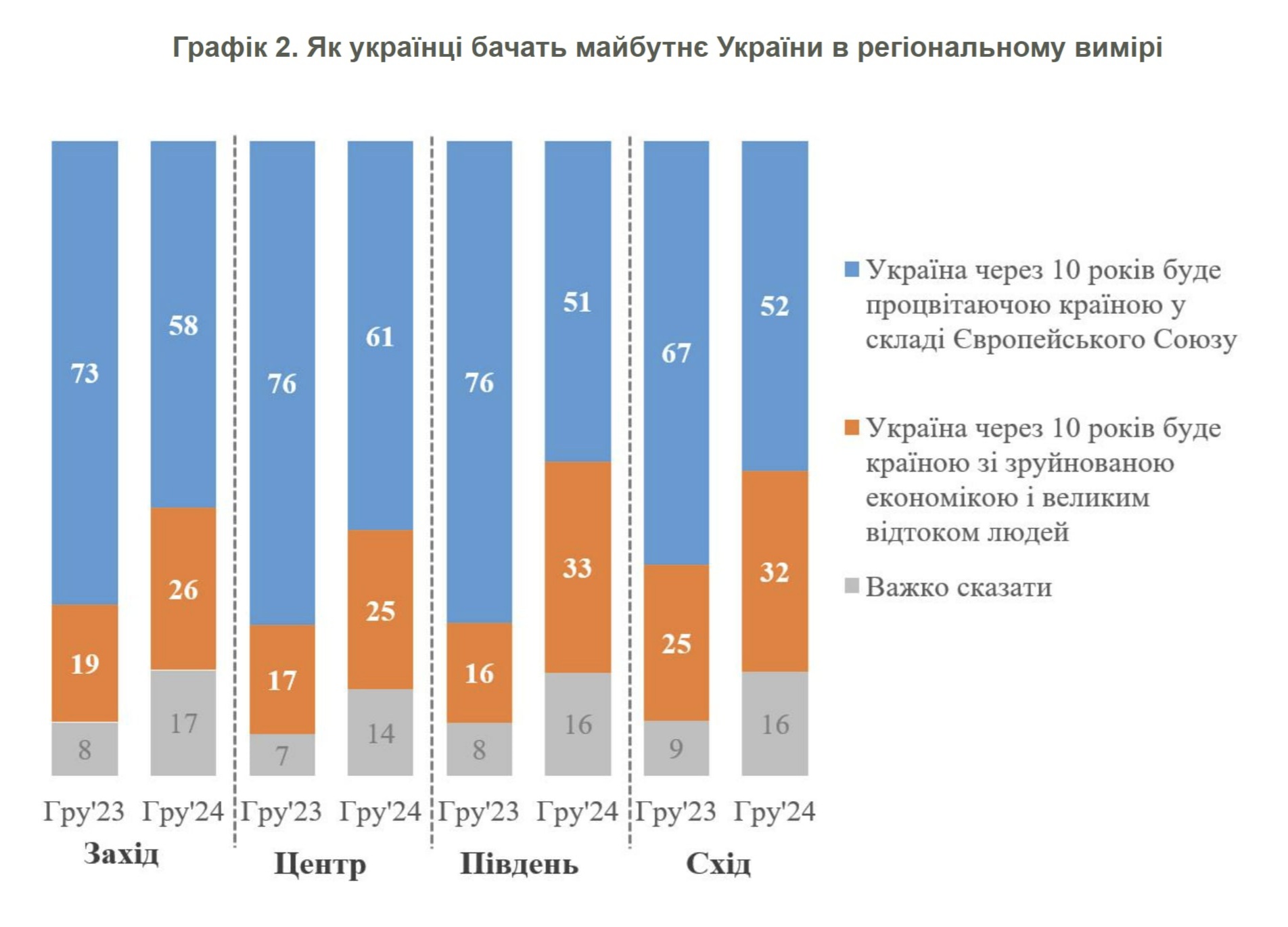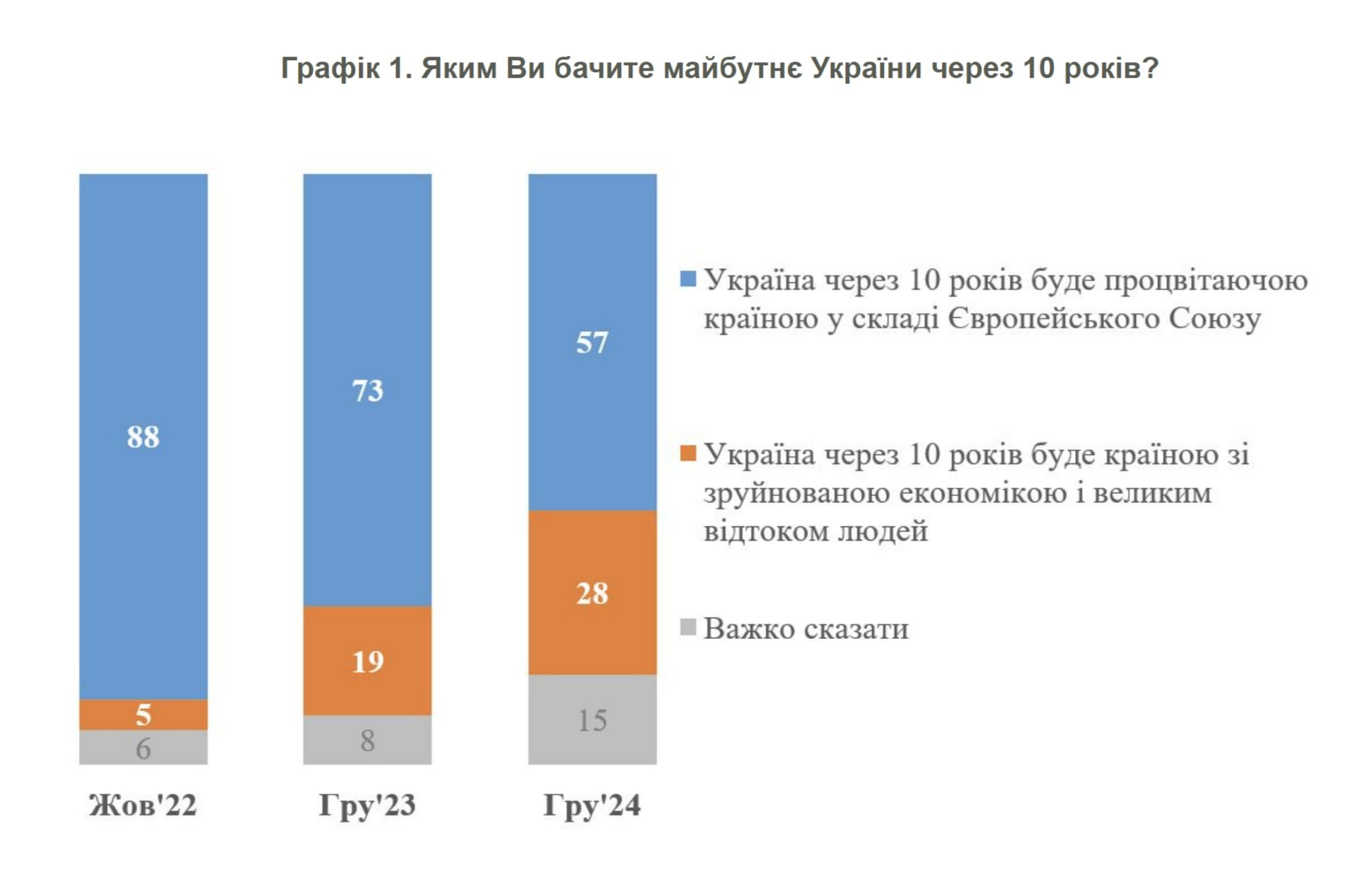 "Якщо наприкінці 2022 року 88% вважали, що Україна через 10 років буде процвітаючою країною в ЄС, то до грудня 2023 року їх частка скоротилася до 73%, а до грудня 2024 року — до 57%", - йдеться в повідомленні.