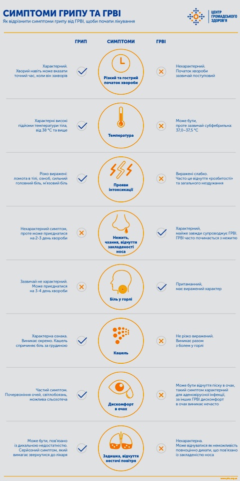 Для ГРВІ характерний поступовий початок, який буде тривати протягом декількох днів, буде відчуватися слабкість або невисока температура. Тим часом симптоми грипу розвиваються різко, з'являється висока температура, болять очі, відчувається ломота в м'язах або озноб. Хворий може визначити, коли саме почалася хвороба.