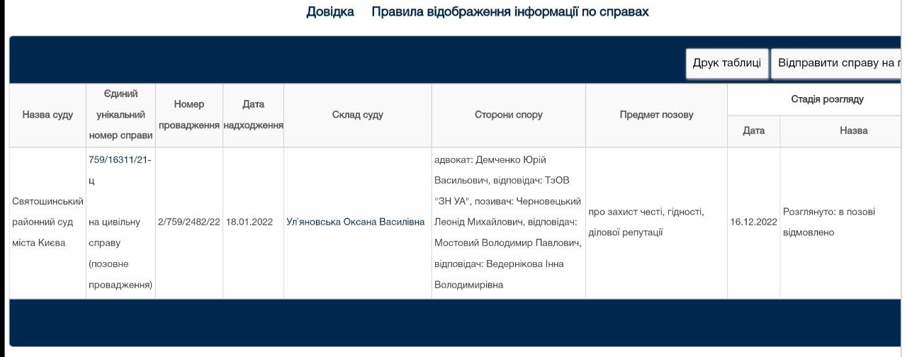 16 грудня 2022 року Святошинський районний суд міста Києва у складі головуючого судді Оксани Уль’яновської позов Черновецького Леоніда Михайловича про захист честі, гідності, ділової репутації, зобов’язання спростувати недостовірну інформацію та відшкодування моральної шкоди – залишено без задоволення.
