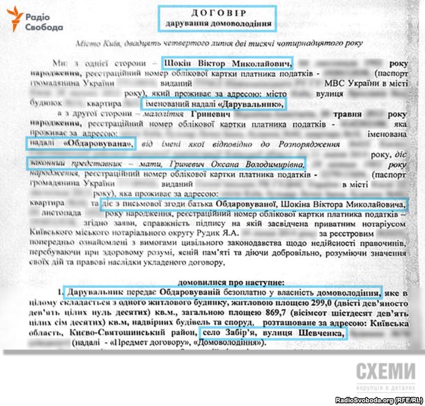 Тоді ж з'ясувалося, що в липні 2014 року Шокін подарував маєток Вероніці-Анастасії Гриневич, але продовжує в ньому проживати. В ряді ЗМІ була озвучена версія, що Вероніка-Анастасія є онукою Шокіна, яка живе в США.