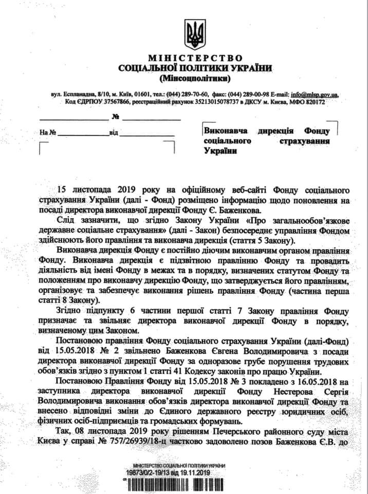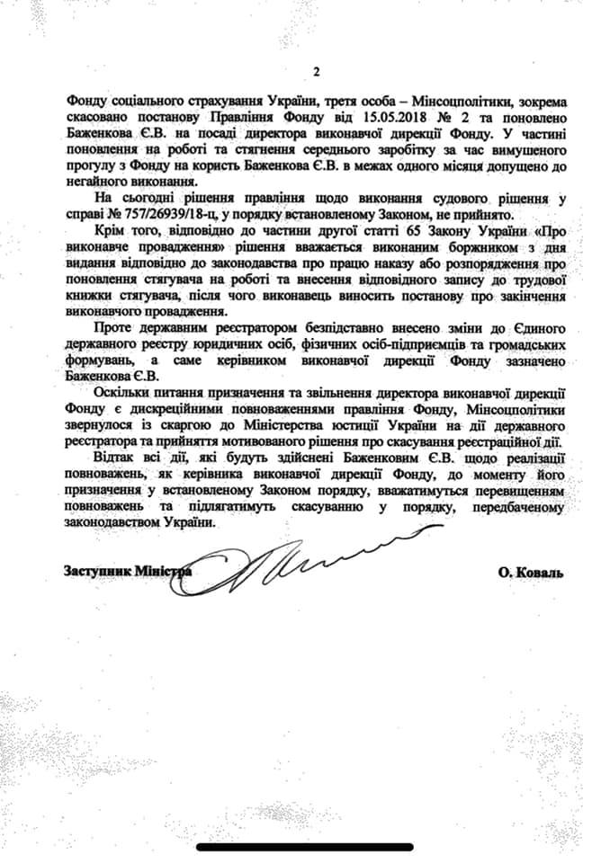 "Мінсоцполітики вважає такі дії реєстратора неприпустимими і звернулося зі скаргою до Мін'юсту з пропозицією скасувати реєстрацію. Я також направив листа до виконавчої дирекції Фонду соціального страхування, де вказано, що всі дії прийняті Баженковим до моменту його законного поновлення на посаді вважатимуться перевищенням повноважень та підлягатимуть скасуванню", - пише заступник міністра.