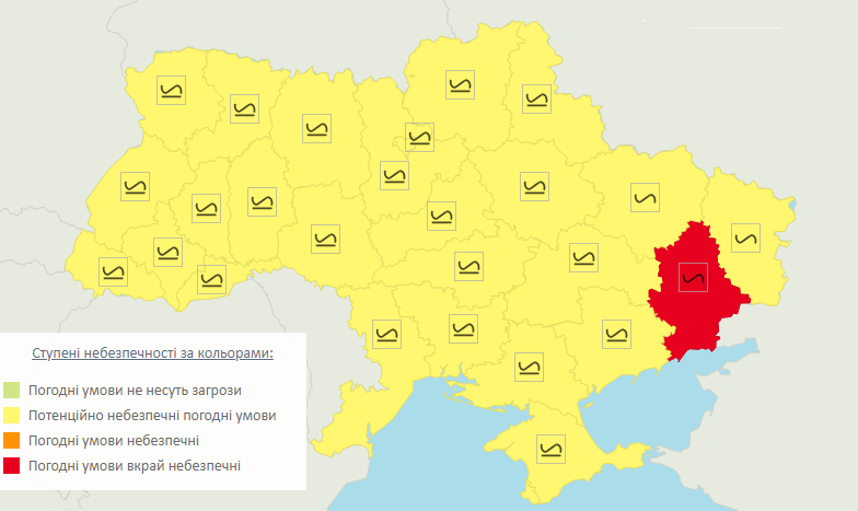 І (жовтий) – погодні умови потенційно небезпечні для людей, навколишнього середовища та інфраструктури. Рекомендується зберігати підвищену уважність та обережність та слідкувати за повідомленнями про можливе подальше погіршення погодних умов.