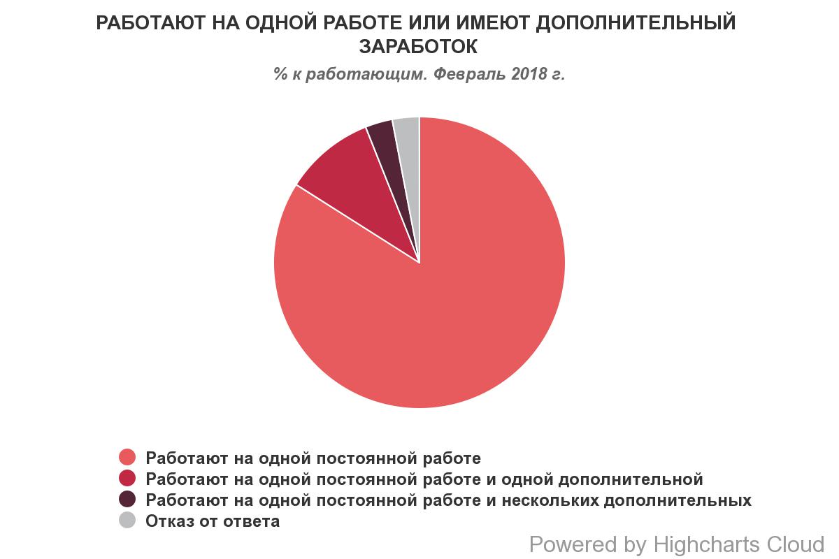 Переважна більшість працюючих українців (84%) працюють на одній постійній роботі, ще 10% мають одну додаткову роботу, а на одній постійній і декільких роботах трудяться 3% жителів країни.