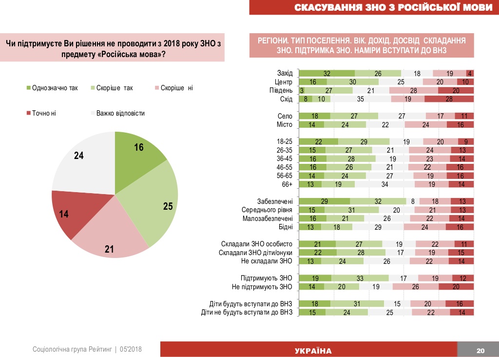 У свою чергу, найбільше опонентів дана ініціатива зустрічає на Сході і Півдні країни, серед людей старшого віку та з найнижчими доходами, а також серед тих, хто не підтримує і не проходив ЗНО, і чиї діти взагалі не планують вступати до ВНЗ найближчим часом.
