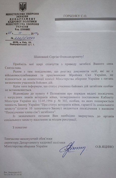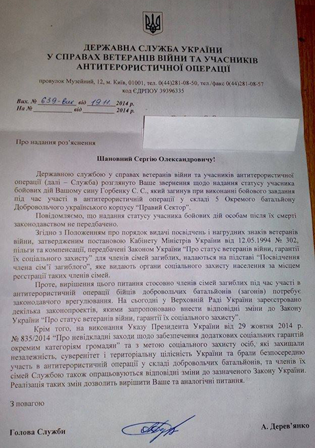 Видання наводить відповідь Держслужби у справах ветеранів та учасників АТО на звернення батька загиблого бійця ДУК "Правий сектор" Сергія Горбенка.